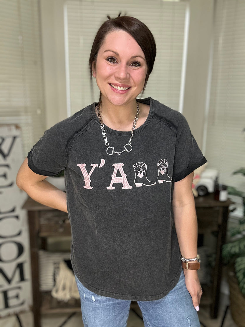 Embrace effortless Southern charm with our Acid Washed Y’all Embroidery Tee. Crafted from 100% soft, breathable cotton, this relaxed-fit shirt combines comfort and style with a lived-in, vintage-inspired acid wash. The embroidered “Y’all” detail adds a touch of playful personality—perfect for spreading good vibes wherever you go.