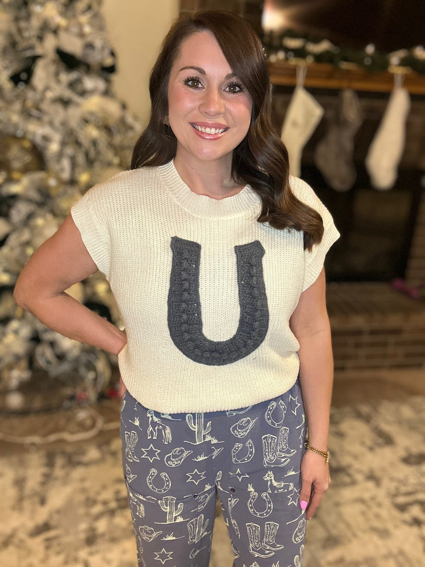 Cozy up with a touch of Western charm. The Horseshoe Ribbed Sweater Vest features a bold, textured horseshoe applique front and center—bringing statement style to your cold-weather wardrobe. Made from a soft blend of ribbed acrylic and cotton knit, this vest delivers both comfort and structure.