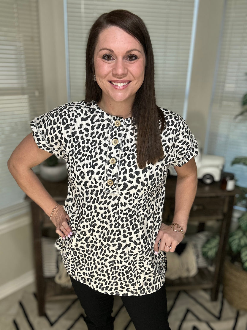 Unleash your bold side with the Run Wild Shirt — where urban edge meets wild elegance. Crafted from a soft, stretchy blend of 95% polyester and 5% spandex, this top offers effortless comfort with a flattering fit. The dolman short sleeves and band round neckline create a relaxed yet chic silhouette, while the front button detail adds a touch of sophistication.